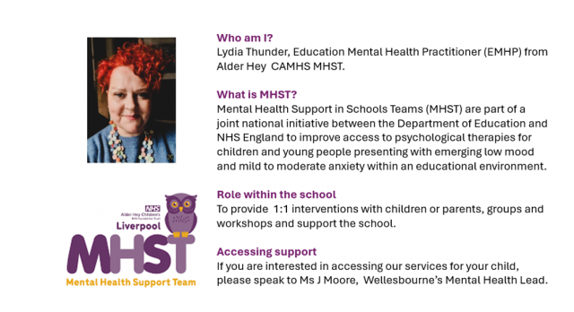 We also seek support from lots of external agencies, one of these being the Mental Health Support in Schools Team (MHST). Below is an introduction to Lydia from MHST and the ways in which she can support.